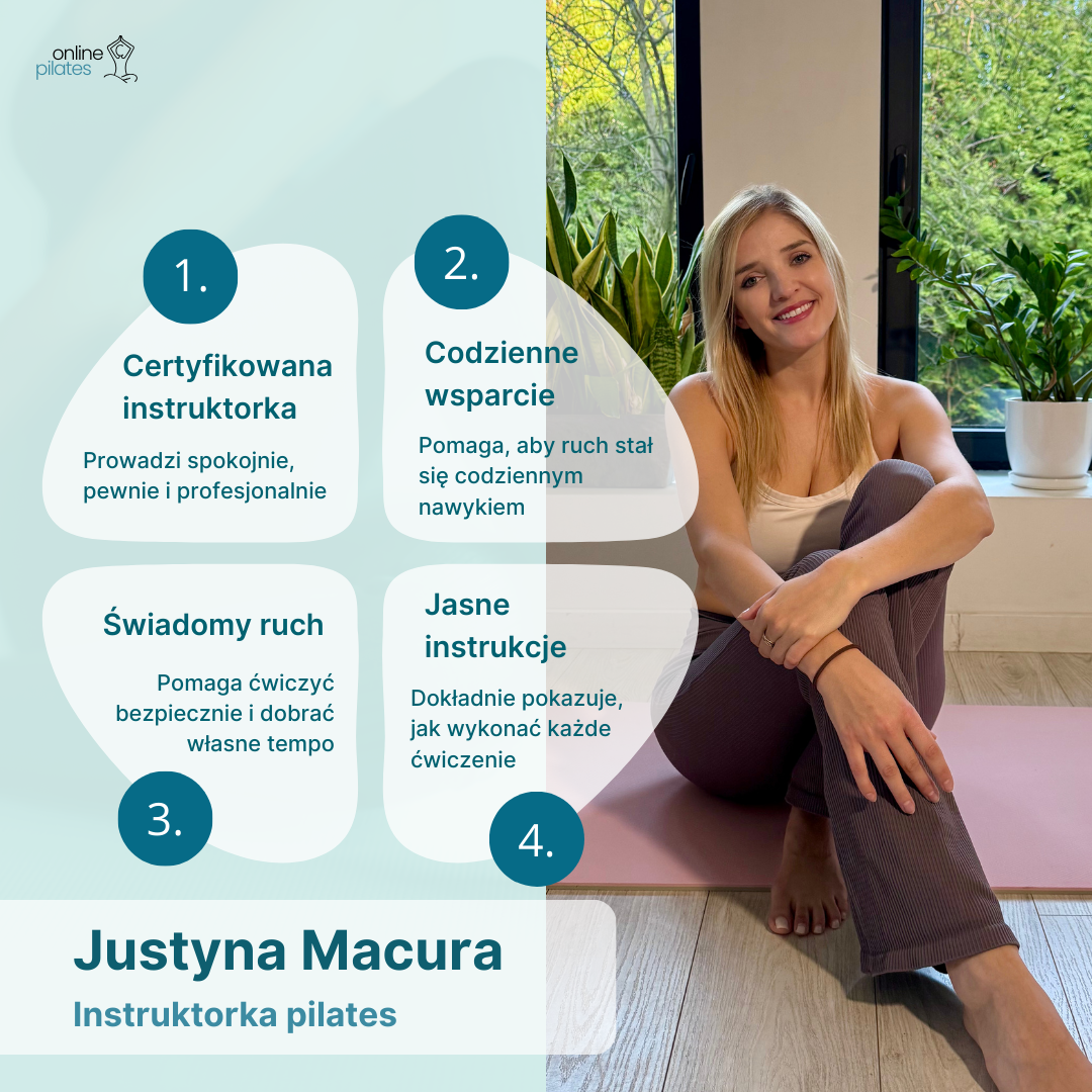 Program prowadzi Justyna Macura – instruktorka pilates, która tworzy spokojną, przyjazną przestrzeń do ruchu. W swoich zajęciach łączy łagodny trening, uważność na ciało i pracę z oddechem.